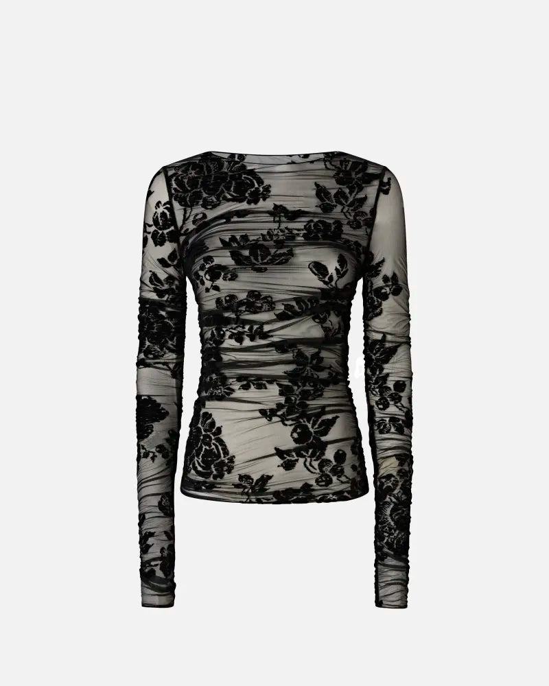 The Puzzle Top is a true statement piece, defined by its rich dévoré effect created through an intricate flocked floral print. The velvet-like texture contrasts beautifully with the sheer base, giving the surface depth, dimension, and a three-dimensional glow. Soft to the touch yet visually complex, this top blends sensuality with sophistication — a refined, artful piece that transforms any look from simple to striking.