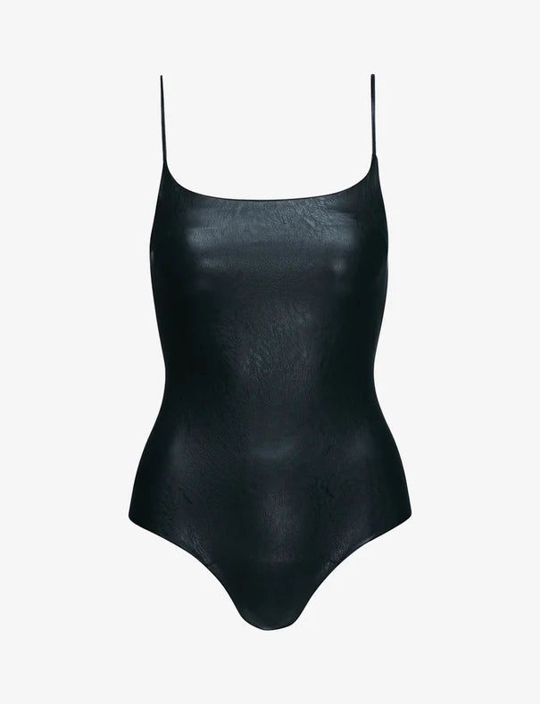 This chic faux patent leather bodysuit is finished with our signature raw-cut thong bottom to keep you shining and line-free.