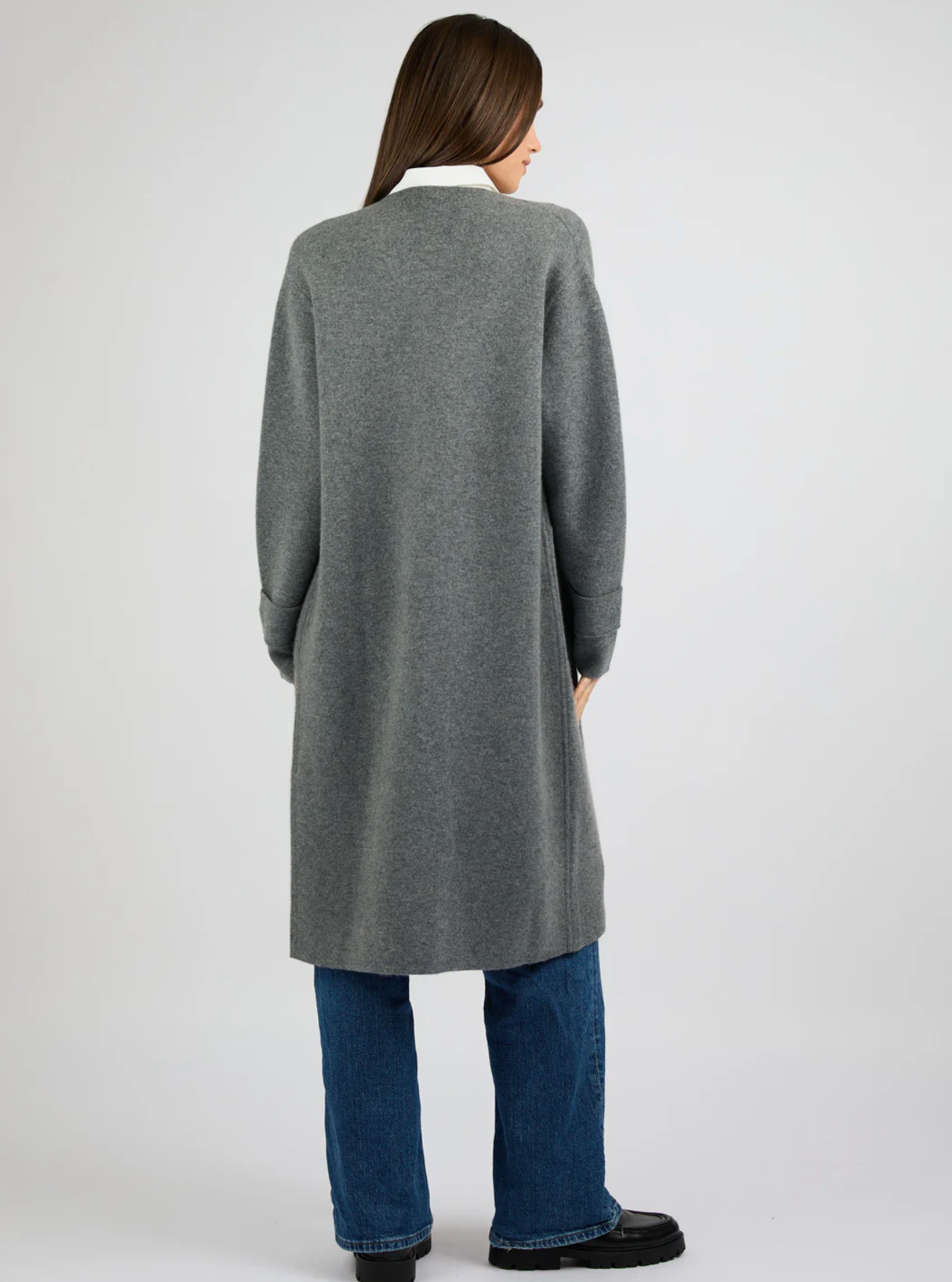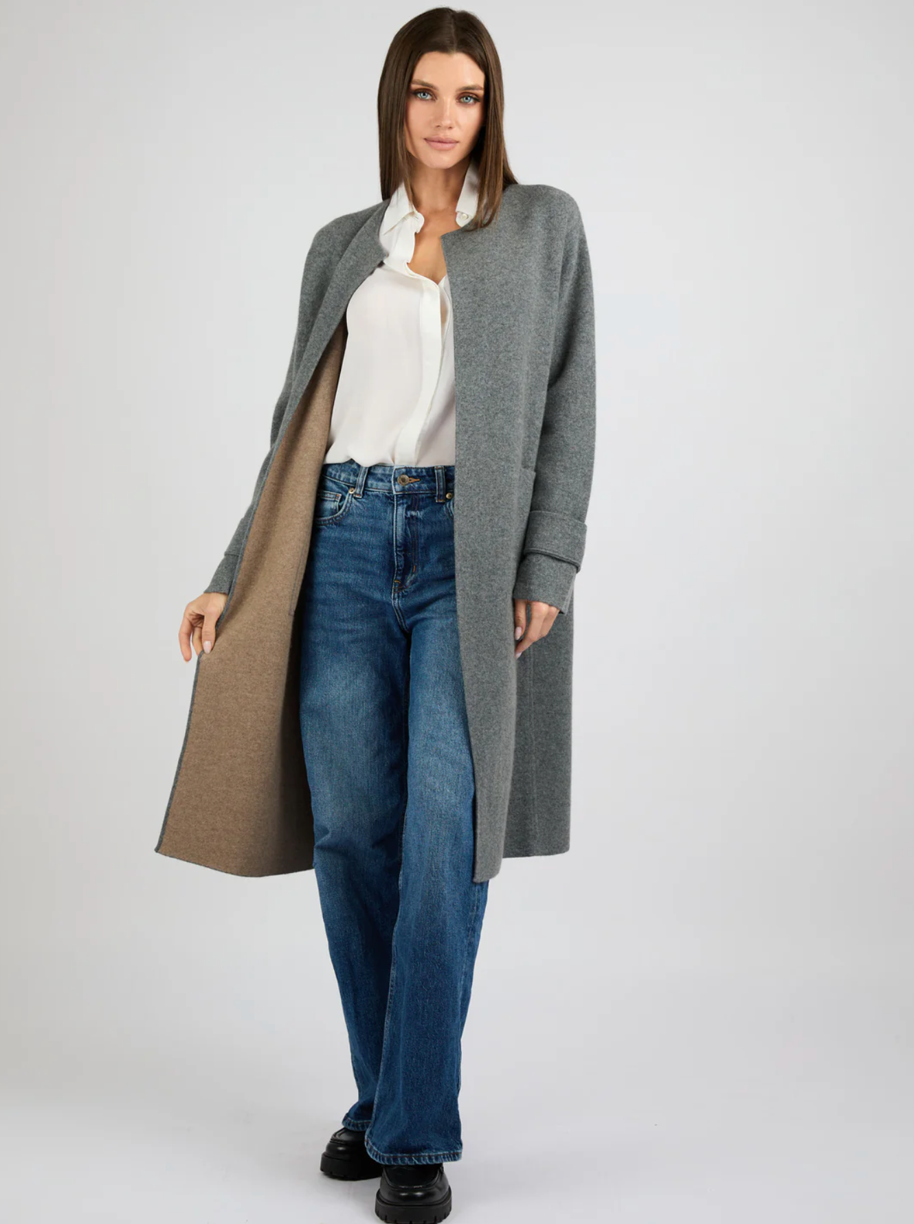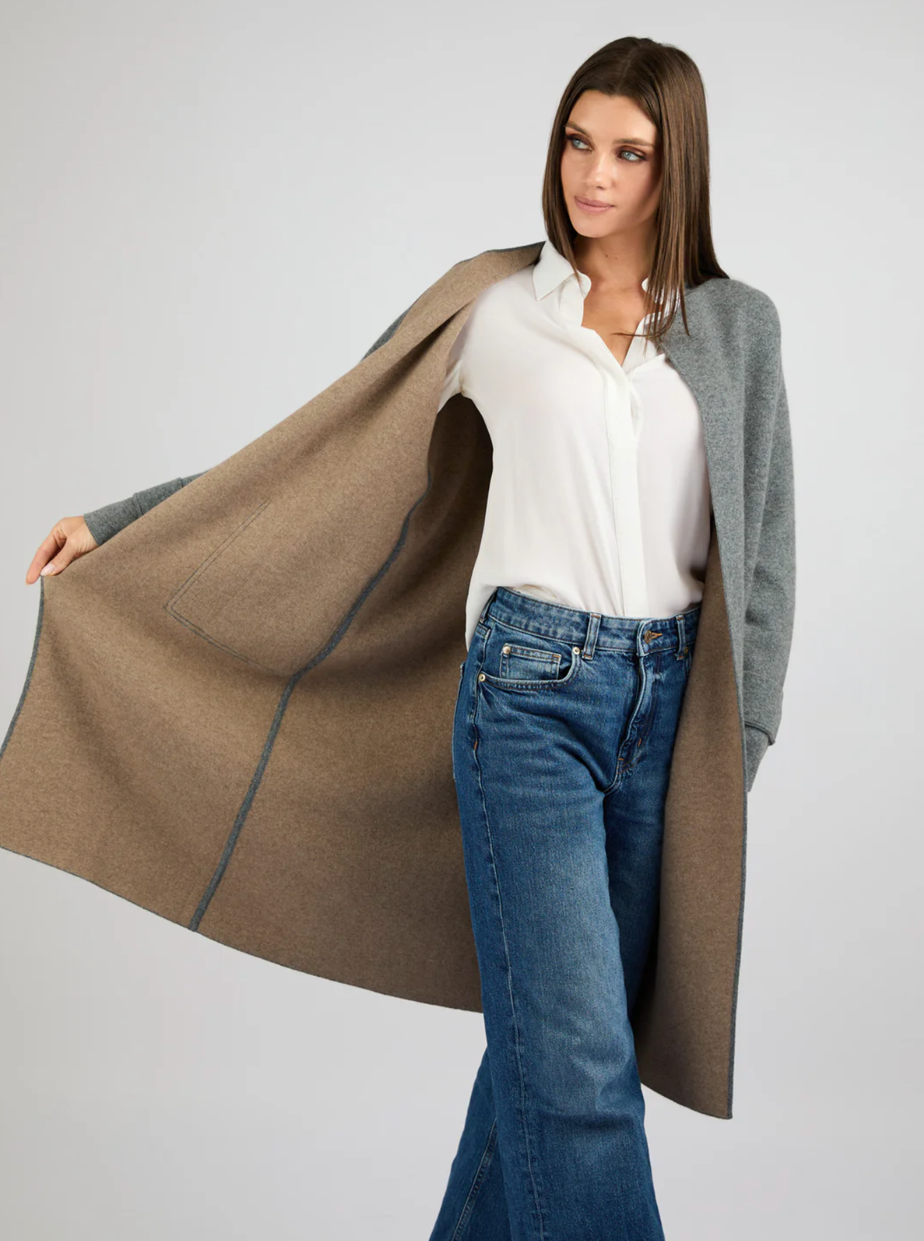 A softly structured double-faced cashmere coat that drapes effortlessly and elevates any look. The contrast grey and fawn palette adds quiet depth, while the open silhouette and patch pockets create an understated, modern luxury.