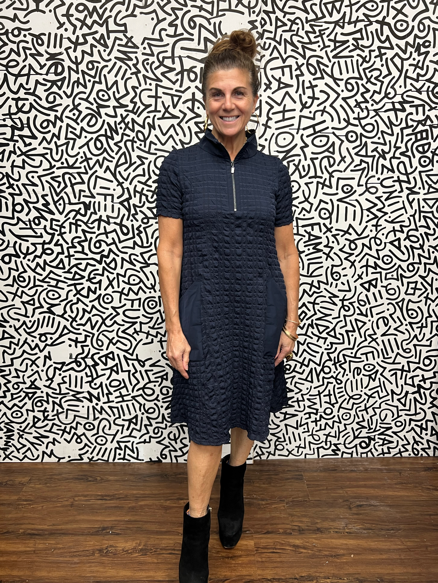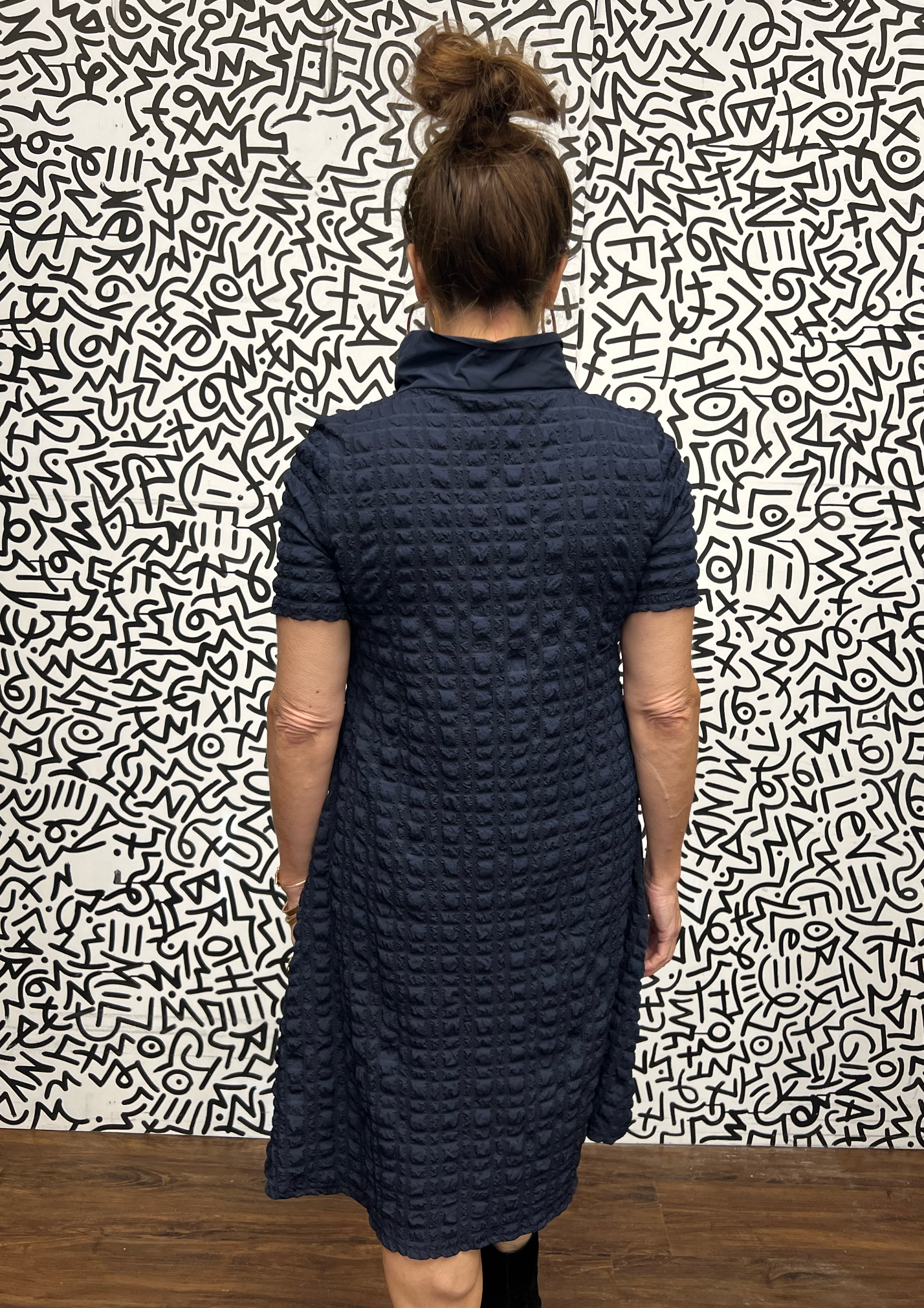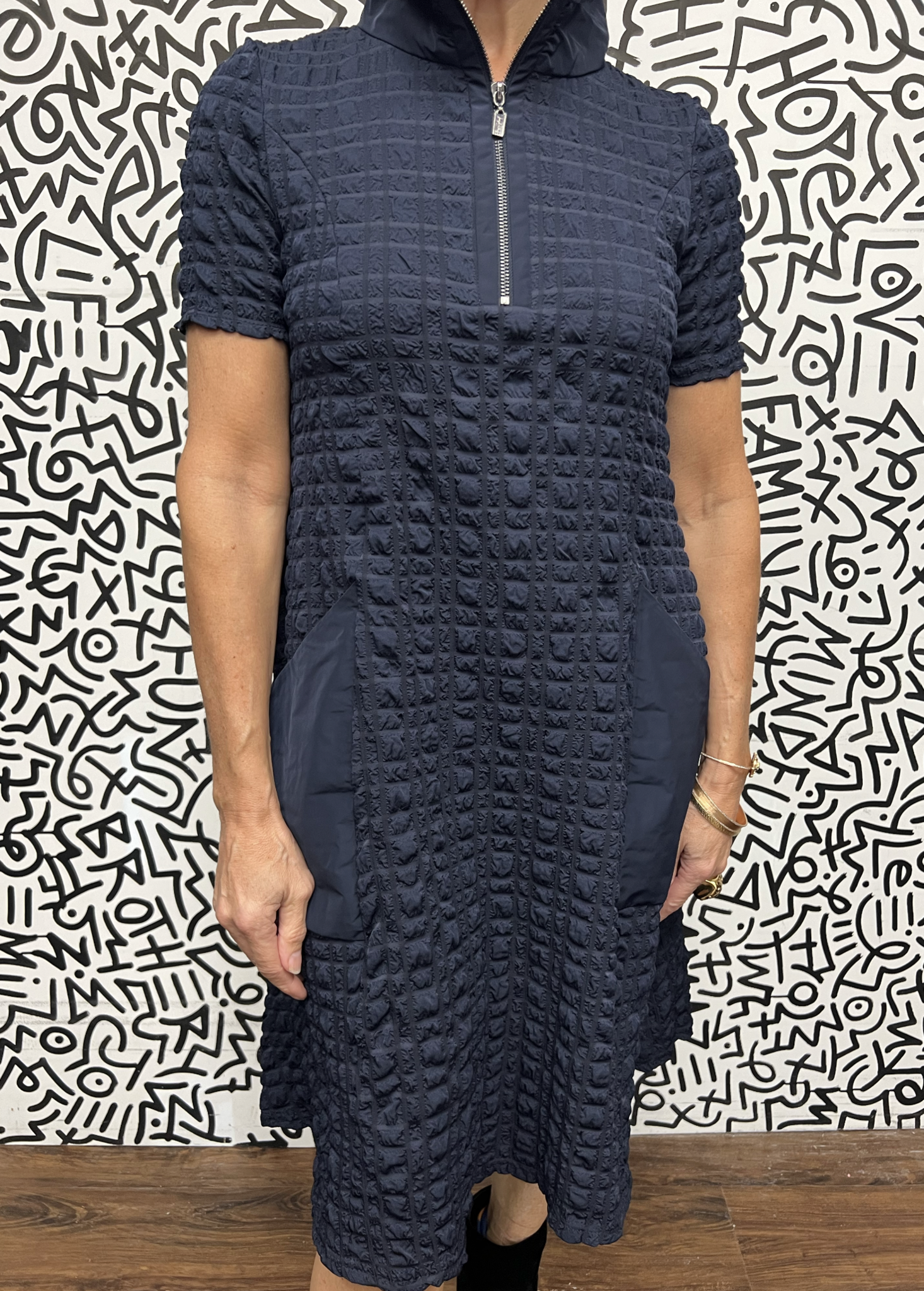This textured puff dress brings effortless sophistication to everyday dressing. Crafted in a structured stretch knit with a subtle raised pattern, it features a polished zip neckline, short sleeves, and a feminine A-line shape. Comfortable, flattering, and easy to style — it’s the perfect elevated casual dress.
