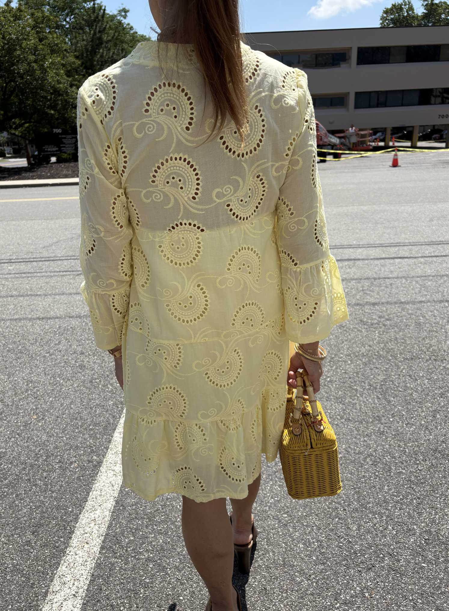A breezy, effortlessly elegant dress featuring intricate eyelet embroidery and a soft tiered silhouette. Designed with a relaxed fit, flounced sleeves, and a flattering split neckline, this piece brings an airy, feminine feel to warm-weather dressing. Perfect for daytime outings, vacations, or elevated casual style.