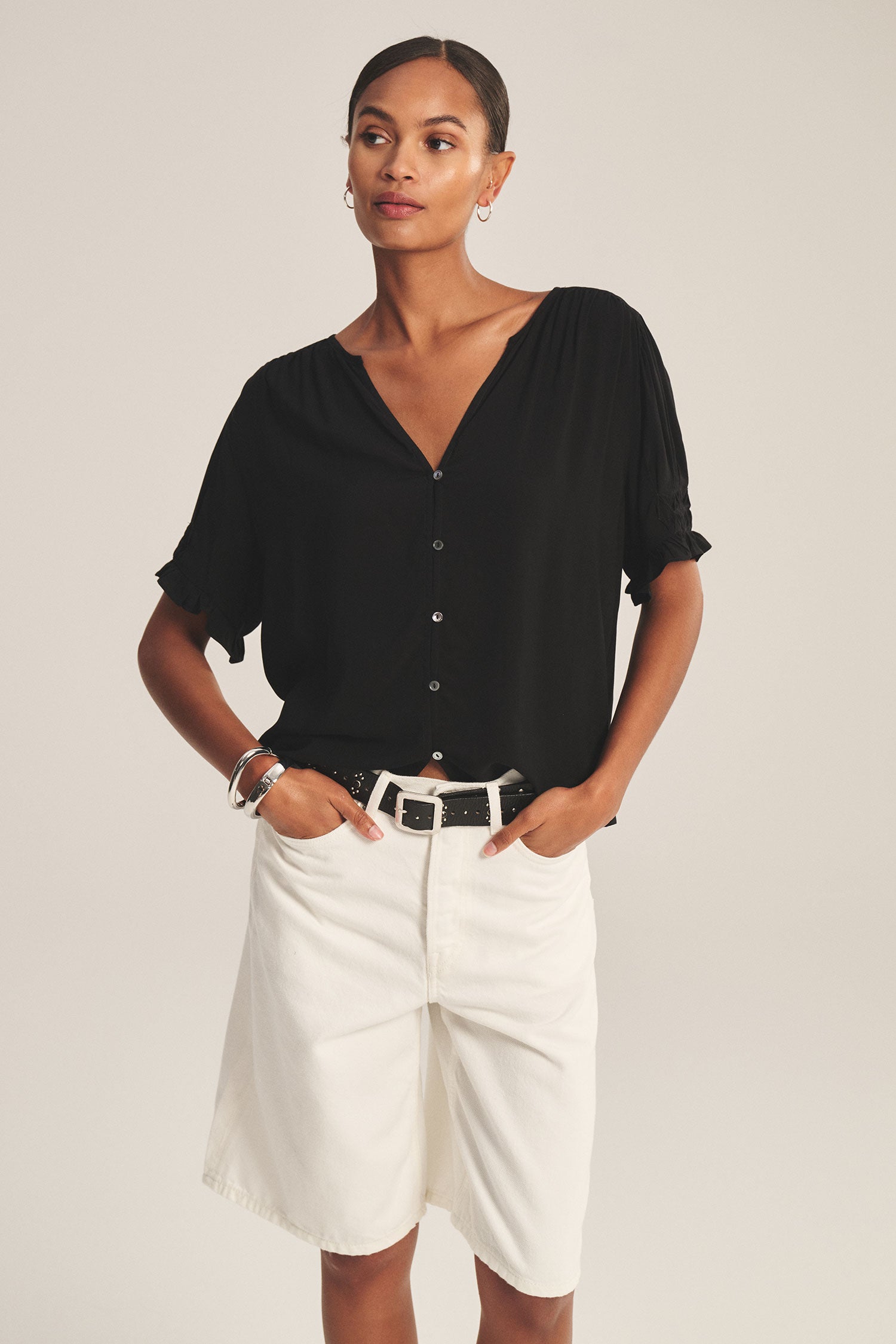 Effortless and timeless, this white button-front blouse is designed for easy, everyday polish. Featuring a relaxed silhouette with a flattering v-neckline and soft short sleeves, it drapes beautifully for a clean, modern look that feels as good as it looks.