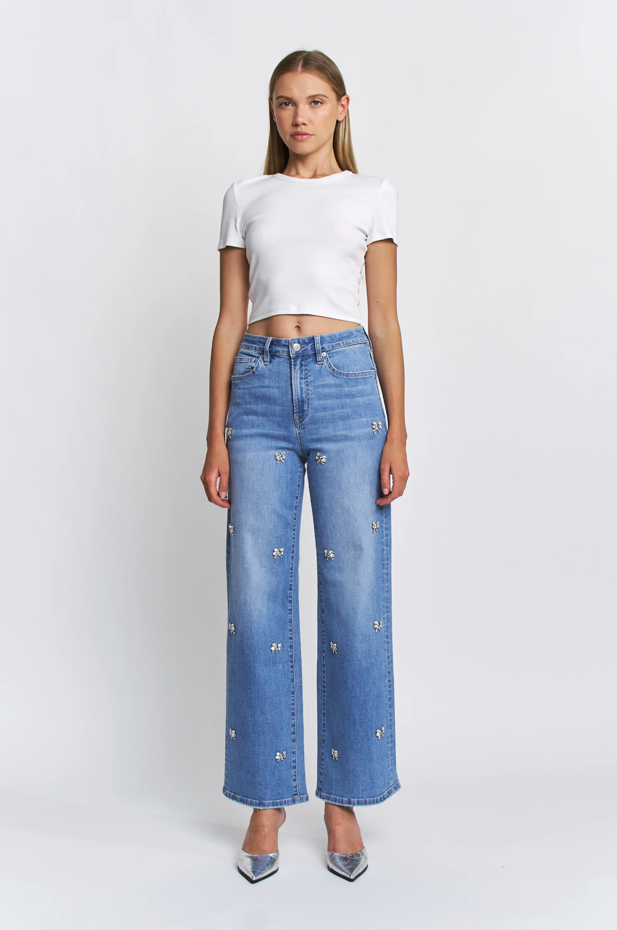 • The High Rise Wide Leg Embellishment Jean by Mica Denim brings a refined statement silhouette with just the right touch of modern drama. Crafted from a premium cotton-poly blend with comfortable stretch, this jean offers a structured yet effortless drape that moves beautifully with the body. The 10.75” rise flatters the waistline, while the 31” inseam and bold 20” leg opening create a clean, elongated wide-leg shape.