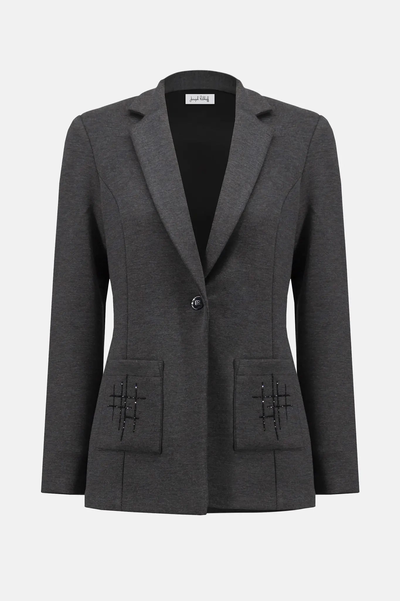 A sleek, modern blazer crafted from a soft scuba jersey blend that delivers comfort with a refined finish. The notched collar and single-button closure offer a classic tailored look, while the crystal-embellished patch pockets add a subtle touch of sophistication. Designed to pair effortlessly with the matching Scuba Jersey Wide Leg Pant for a chic, coordinated set.