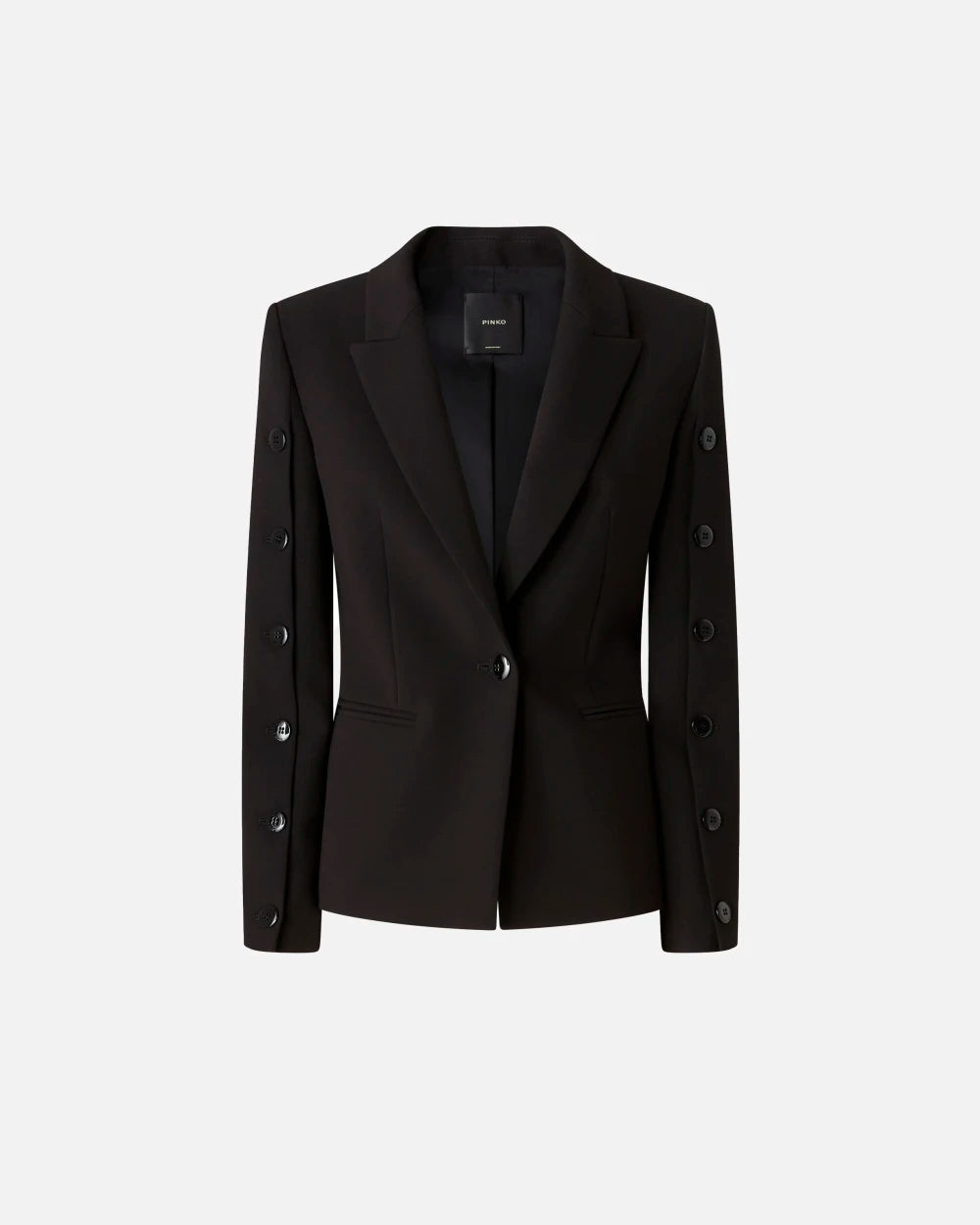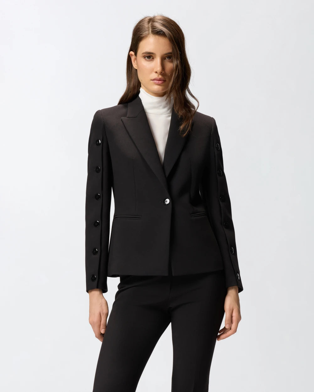 A modern, sculpted take on classic tailoring. This single-breasted blazer is crafted from a silky technical viscose blend that delivers fluid drape with structured refinement. Designed with a cinched waist for a flattering silhouette, the standout detail is the button-open sleeves — allowing the jacket to transform into a subtle cape effect. Elegant, versatile, and endlessly polished, it’s the perfect statement layer for both daytime wear and elevated evenings.