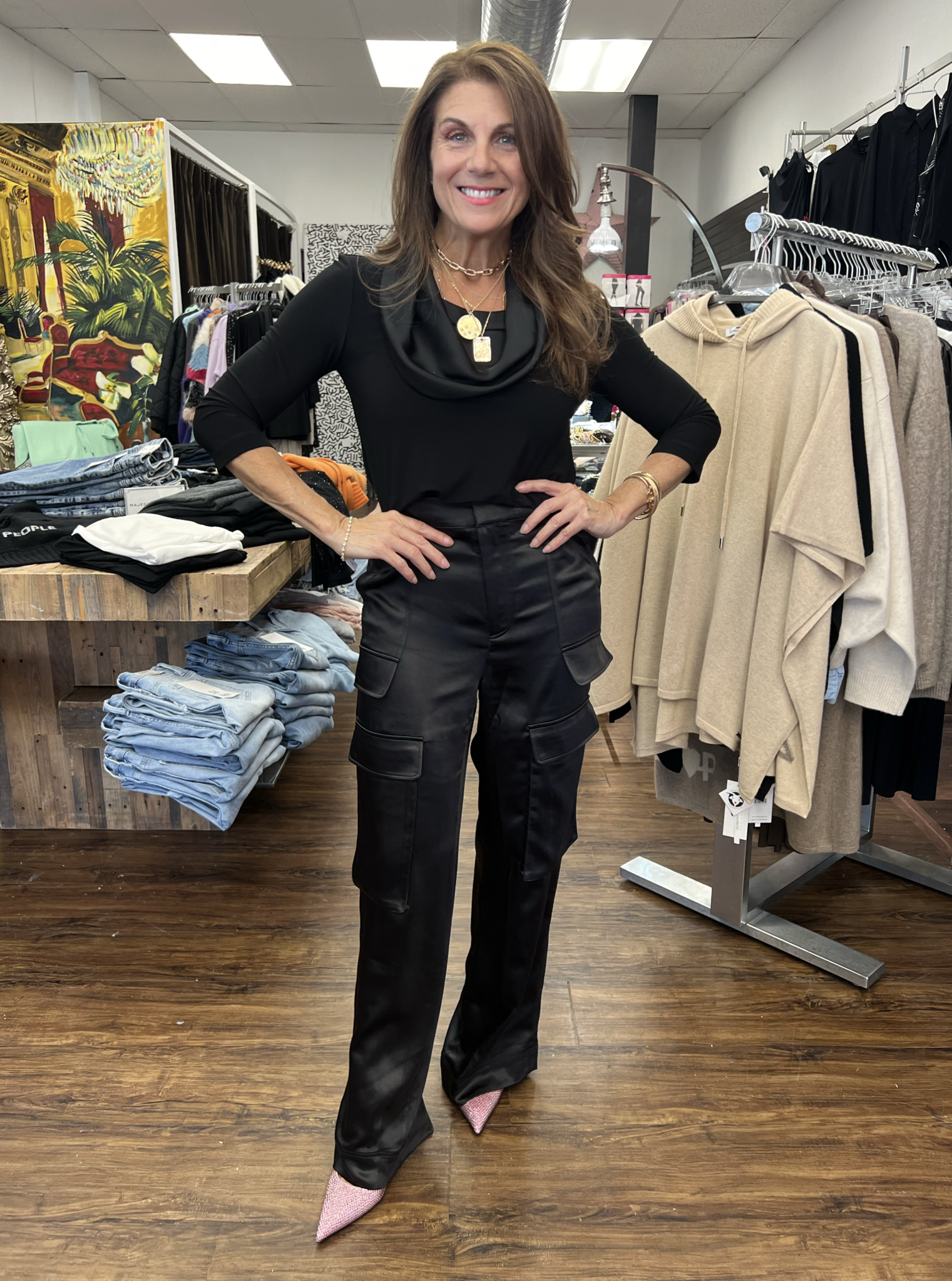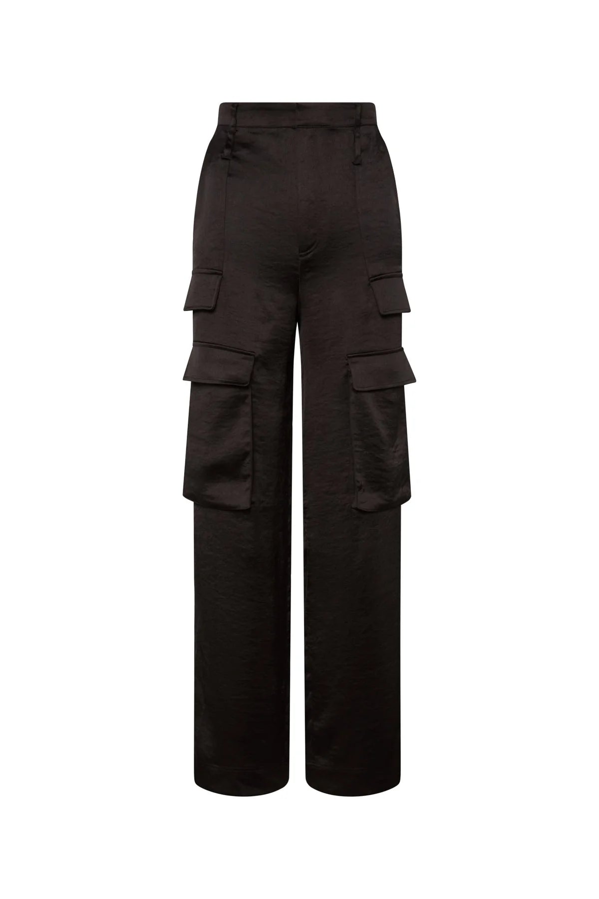 A modern take on utility dressing, this satin-finish cargo pant blends effortless cool with a sleek, elevated drape. Designed with a relaxed silhouette that moves fluidly with the body, it features traditional cargo pockets reimagined in a softer, more refined fabrication. The silky 100% polyester construction delivers subtle sheen and comfort, making it versatile enough for day-to-night styling. Pair it with a fitted tank, a knit, or a luxe blouse for a chic, urban look.