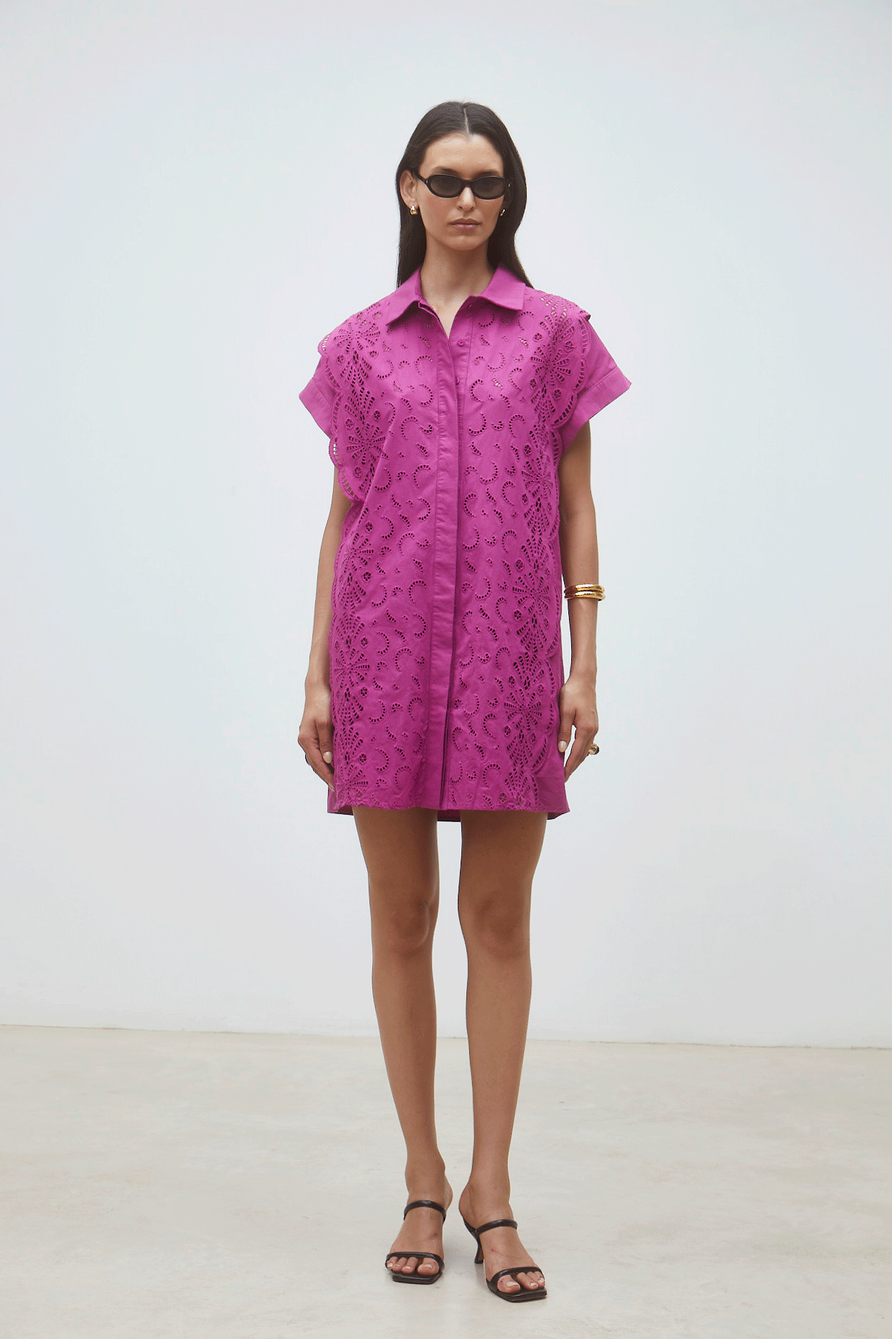 A bold pop of color meets effortless structure in this fuchsia eyelet mini dress. Designed in a lightweight cotton with delicate cutwork detailing, this piece blends feminine texture with a modern, tailored silhouette.