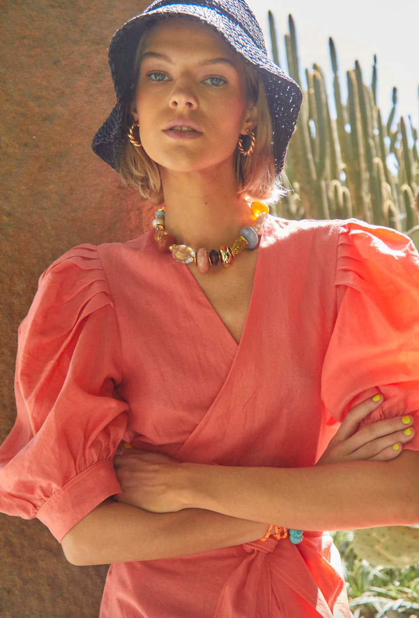 A dreamy blend of romance and modern ease, this puff-sleeve wrap top is crafted in a lightweight, breathable fabric that drapes beautifully on the body. The gathered sleeve detailing adds soft volume and shape, while the wrap silhouette cinches effortlessly at the waist for a flattering, feminine fit. Finished in a fresh coral hue, it’s the ideal piece for warm days, vacations, or any moment that calls for effortless polish.