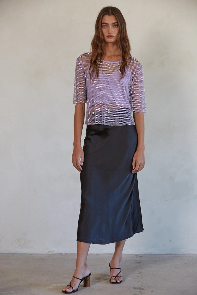 A sparkling statement piece designed to turn heads, this rhinestone fishnet crop top features a delicate woven polyester construction that catches the light with every movement. Its round neckline and short sleeves balance the bold rhinestone detailing with a clean, modern shape, while the optional cami lining offers added versatility. Wear it layered for a polished night-out look or style it solo for high-impact glamour. A standout top that blends shimmer, texture, and contemporary edge.