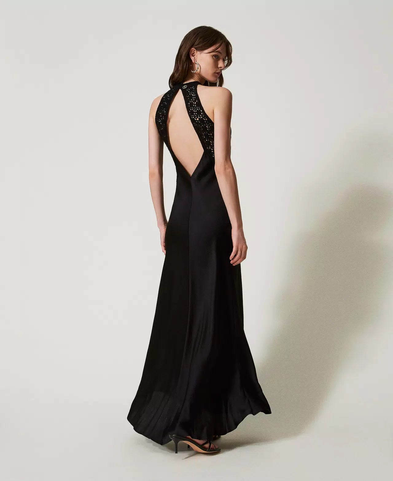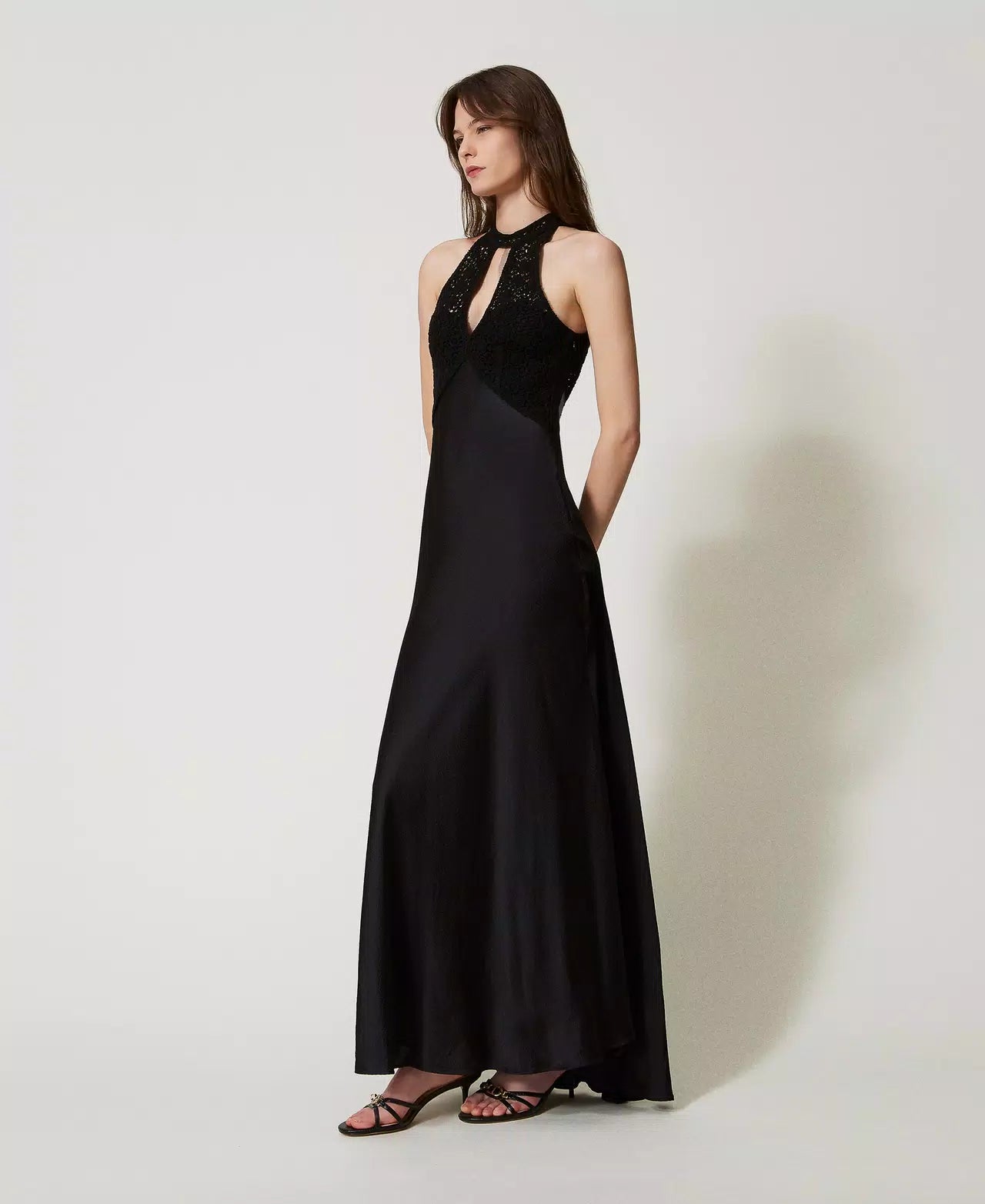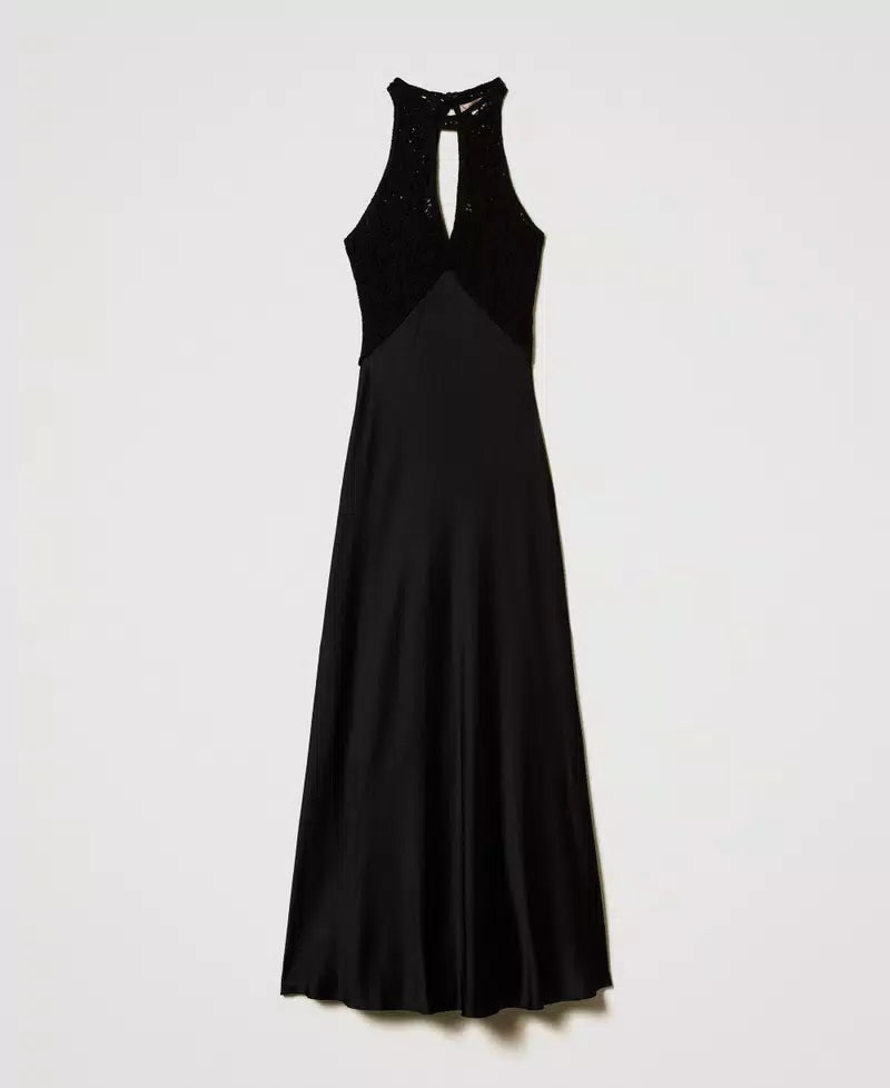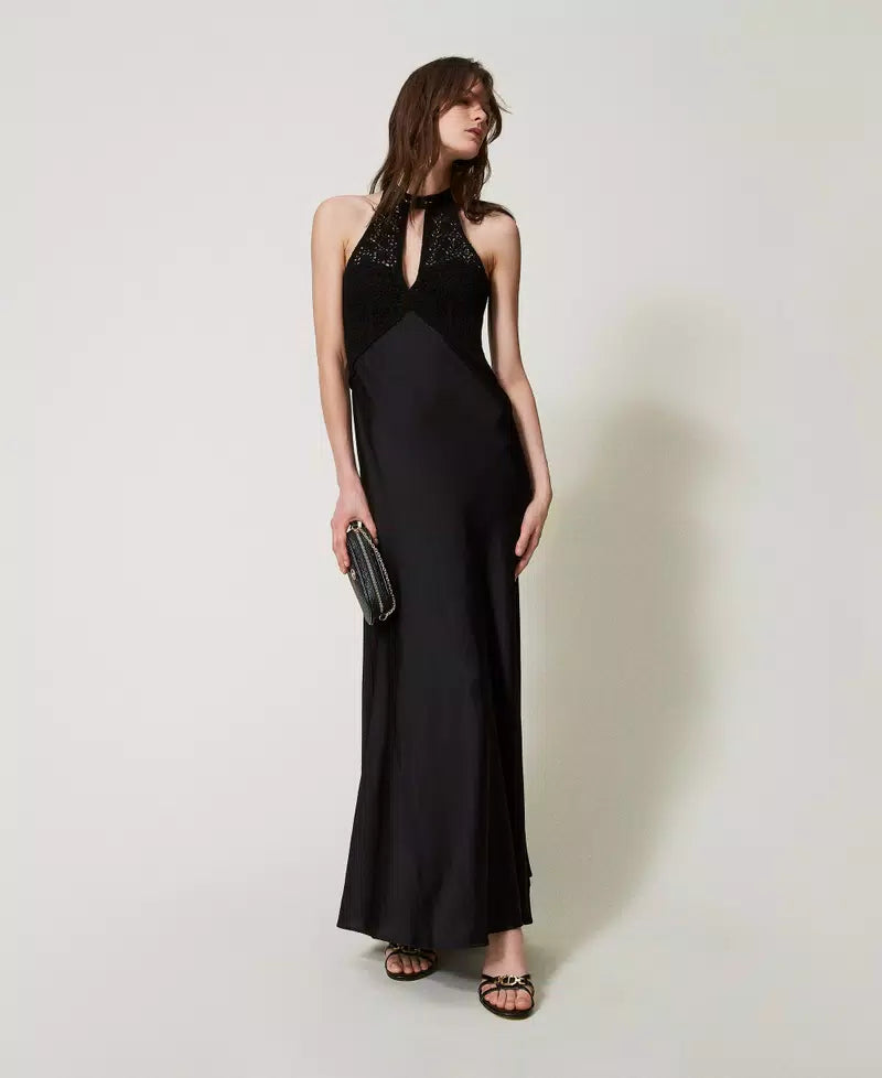A stunning black evening dress with a sculpted silhouette and elegant lace detailing. The Abito Dress features a fitted bodice, a flowing skirt, and a sophisticated halter neckline with a delicate keyhole cutout. Its fluid viscose blend drapes beautifully, while the mixed-media lace adds refined texture and allure. A timeless, elevated piece for nights out, events, and formal occasions.