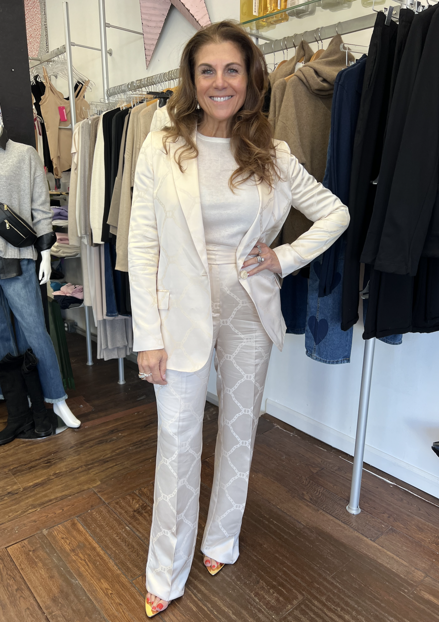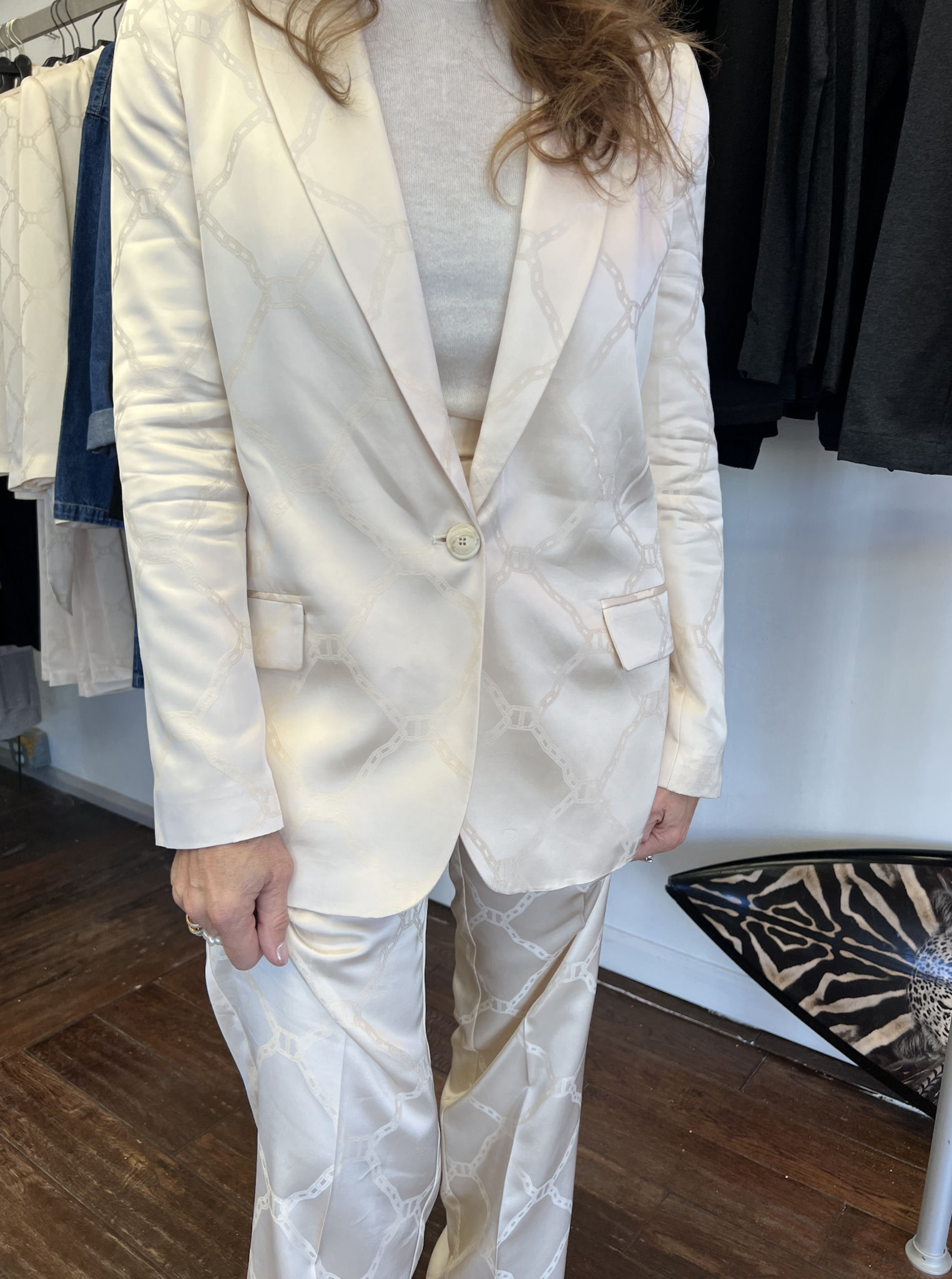 A tailored ivory blazer elevated with a subtle jacquard oval pattern for a sophisticated textural finish. Designed with a clean lapel, structured shoulders, and a slim silhouette, this blazer instantly sharpens any look. Style with trousers for a full set or pair with denim for effortless chic.