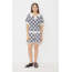 This short-sleeved crochet polo features a navy and cream granny-square pattern with a classic collar and open placket. Its relaxed fit and vintage-inspired design add a chic, handmade touch, making it a stylish and versatile summer staple.